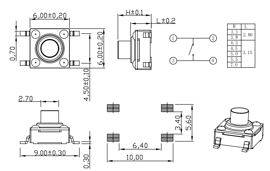กะทัดรัดและแม่นยำ (6×6 มม.) - การออกแบบประหยัดพื้นที่เหมาะกับพื้นที่จำกัดได้อย่างลงตัวในขณะที่ยังคงสัมผัสที่ตอบสนองได้ดีสำหรับการป้อนข้อมูลของผู้ใช้ที่แม่นยำ